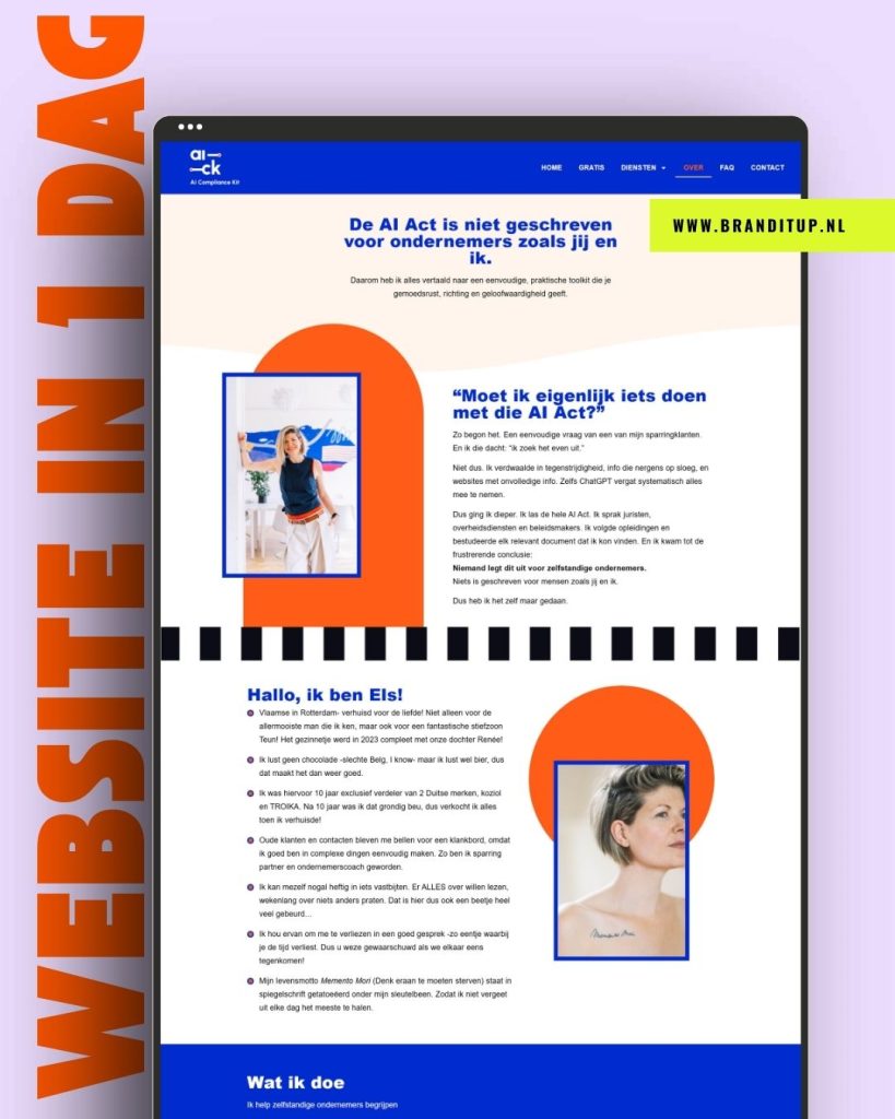 Voor Els ontwikkelden we al een krachtige nieuwe branding, maar haar website pastte daar niet meer bij. Ze wilde uitstralen: “ik ben een expert en geen standaard AI-tool”, en groeien naar meer zichtbaarheid.