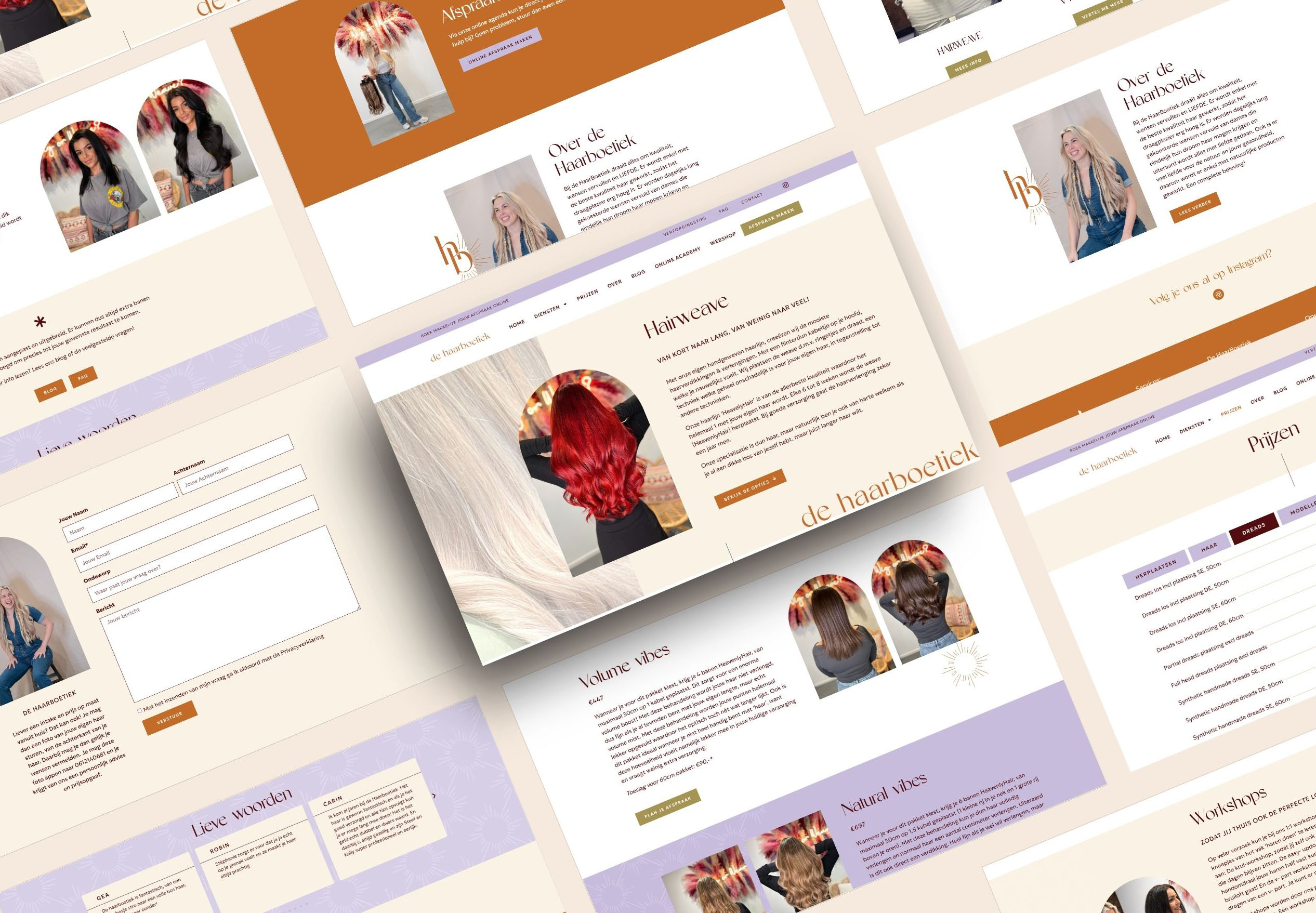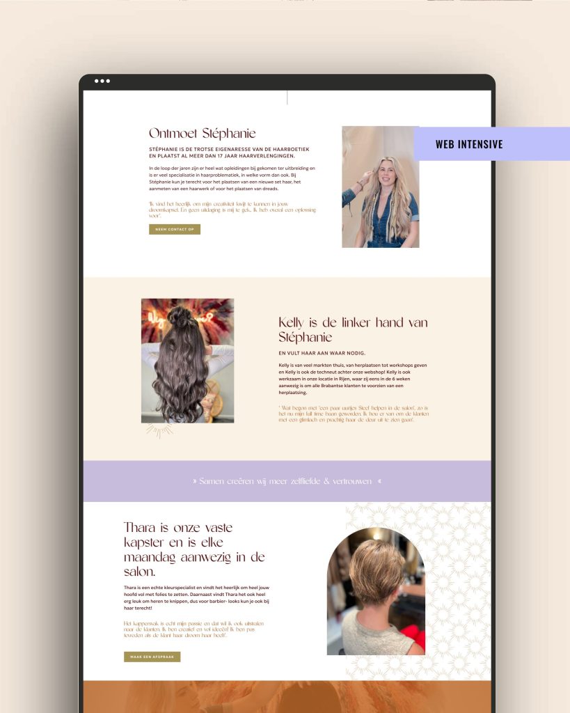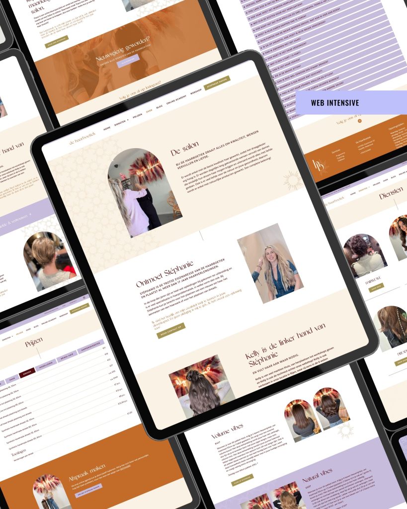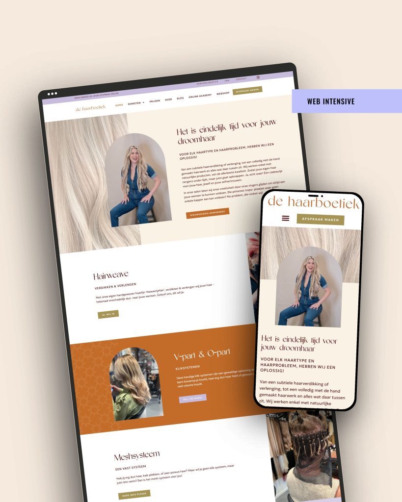 Het resultaat? Een website die elegant is, vriendelijk en waar de diensten en branding van de HaarBoetiek écht tot hun recht komen!